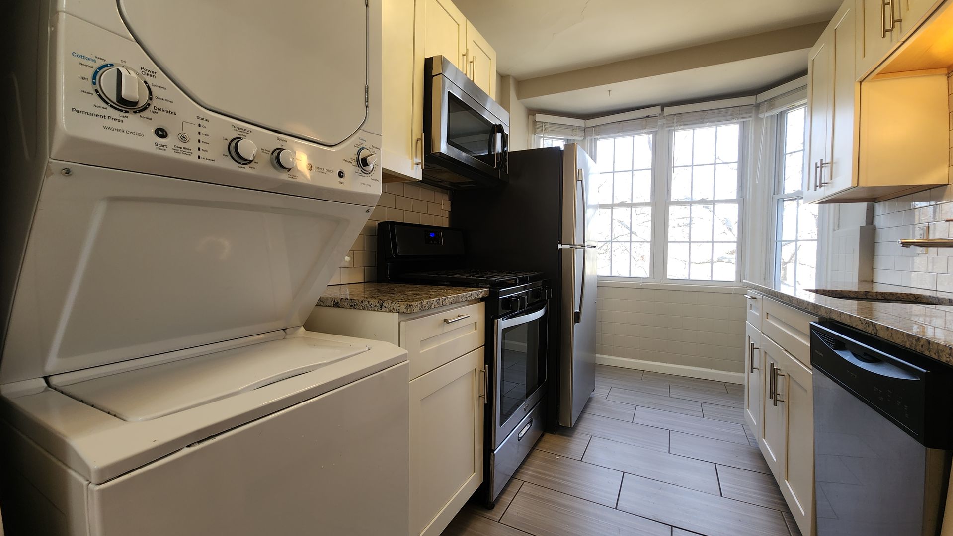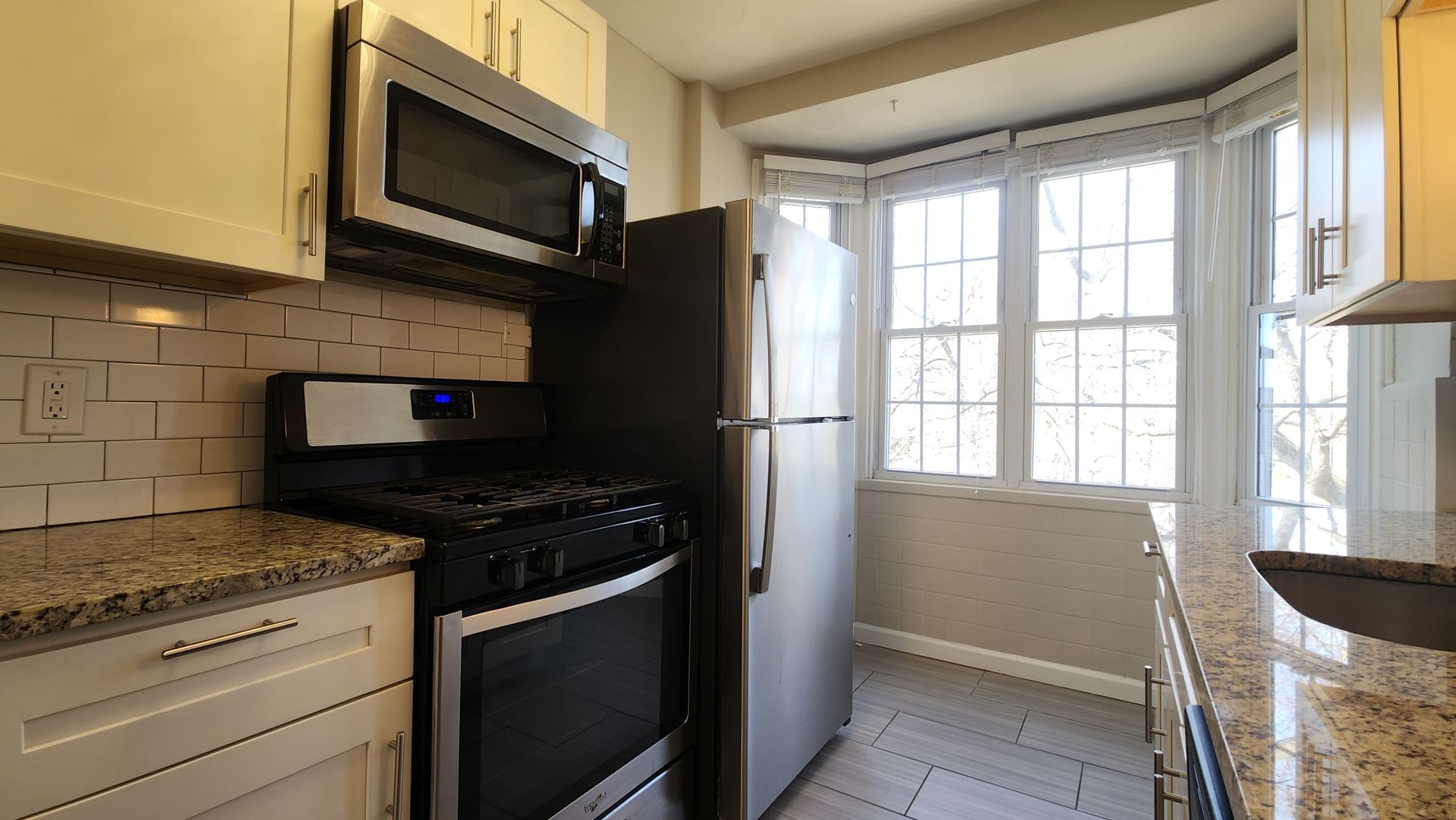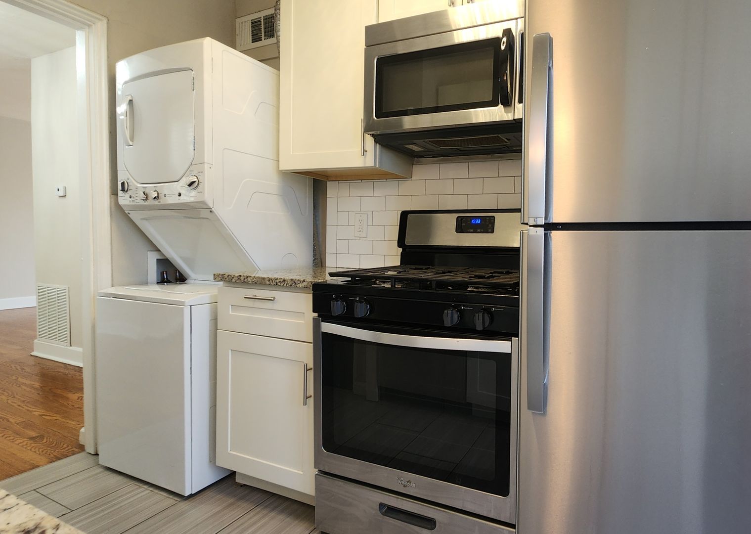 Updated modern kitchen with granite counter tops and stainless steel appliances