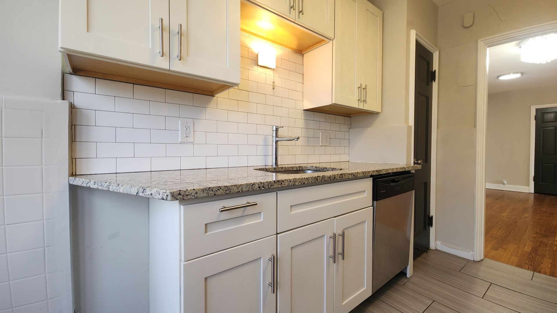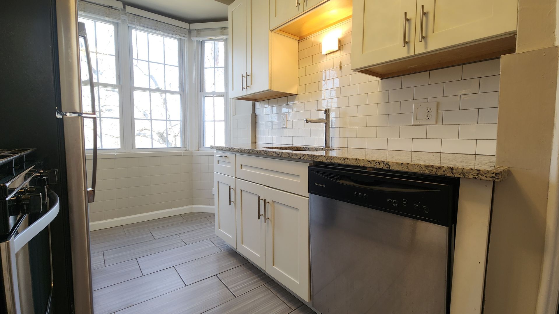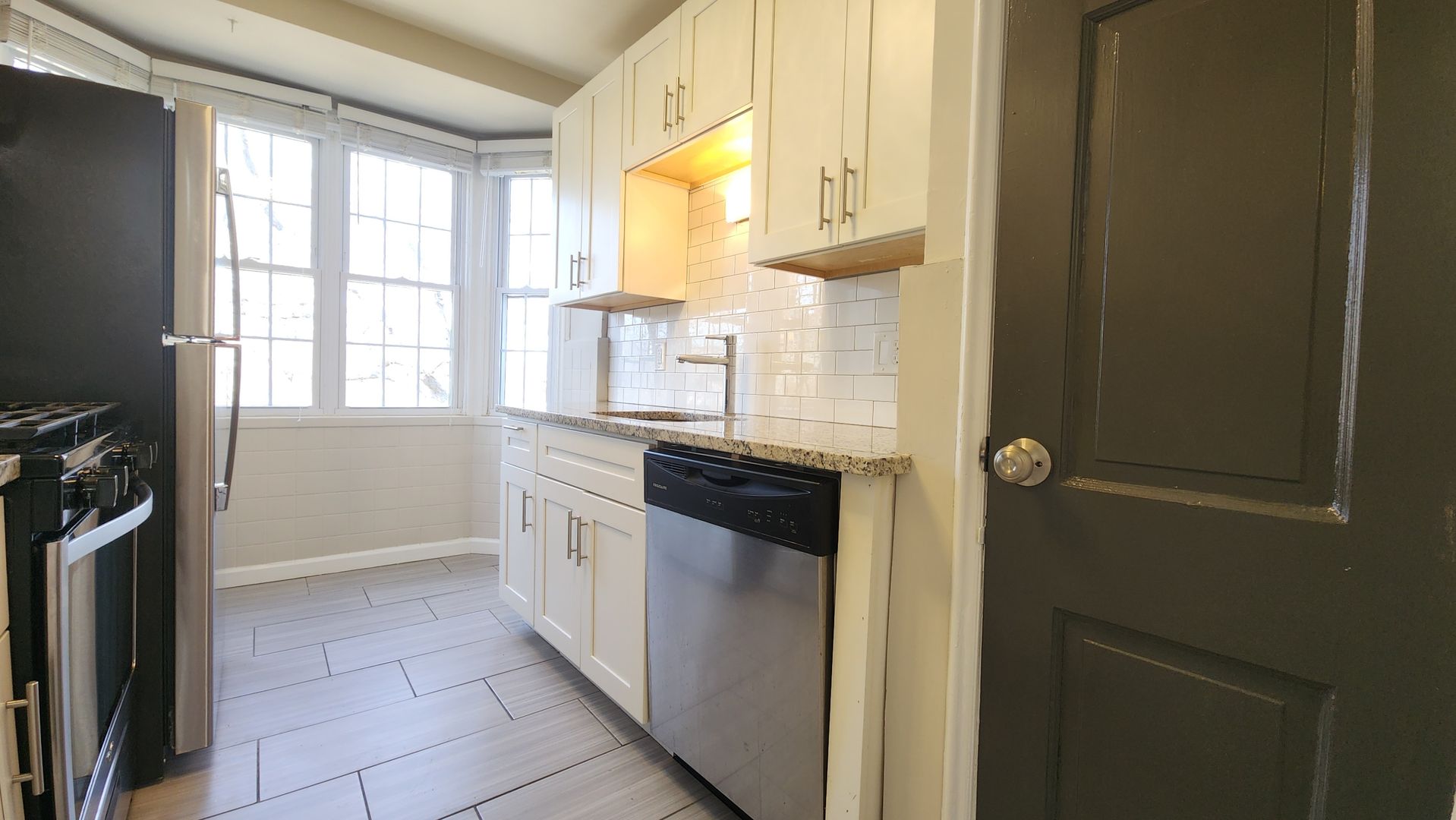 Updated modern kitchen with granite counter tops and stainless steel appliances