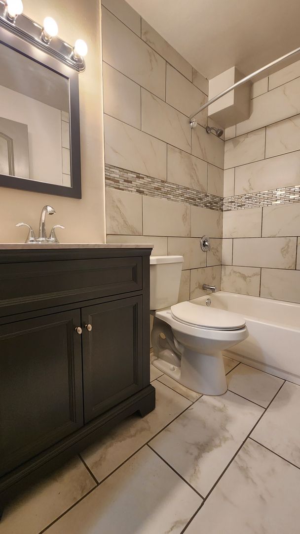 - Updated modern bathroom including new vanity, light fixtures and plumbing hardware