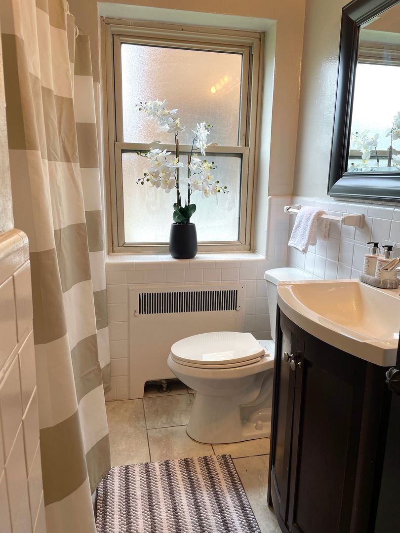 Updated bathroom includes tile flooring, new lighting and plumbing fixtures