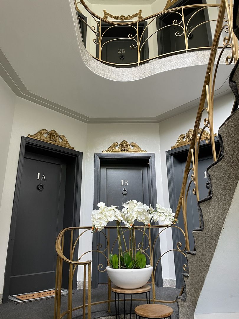 Decorative stained-glass windows in the building and the unit