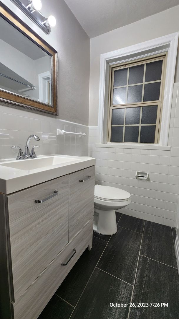 Updated and modern refinished bathroom with updated vanity and new flooring